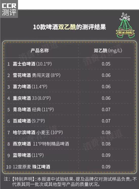 测试结果显示,10款啤酒双乙酰含量较低,达到“优级”,整体表现较好。
