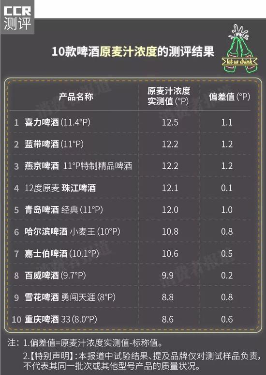 1、10款啤酒原麦汁浓度都高于其标称值,表明这些啤酒投料都很“良心”;