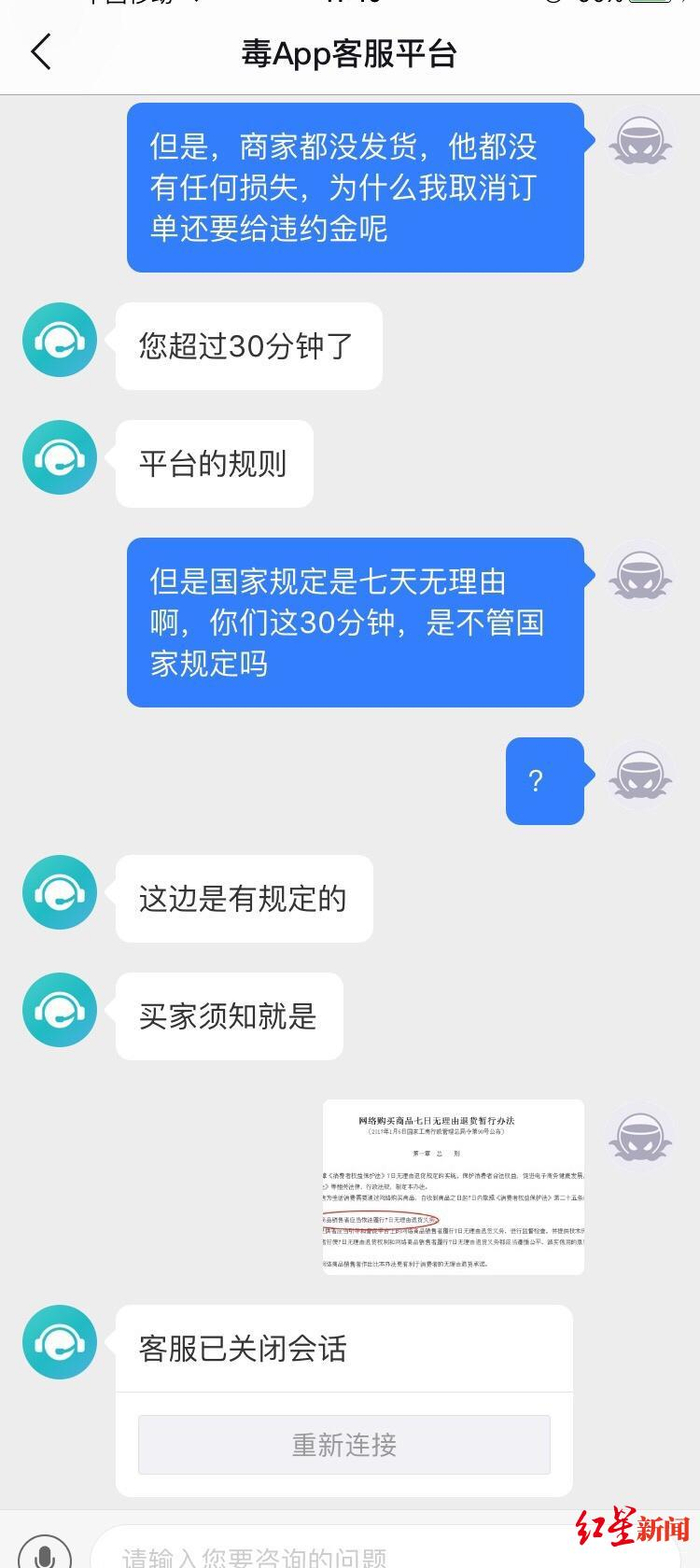而当记者提及根据《网络购买商品七日无理由退货暂行办法》第三条,网络商品销售者应当依法履行7日无理由退货义务。并将该文件截图给客服时,客服直接关闭了对话,不做回应。