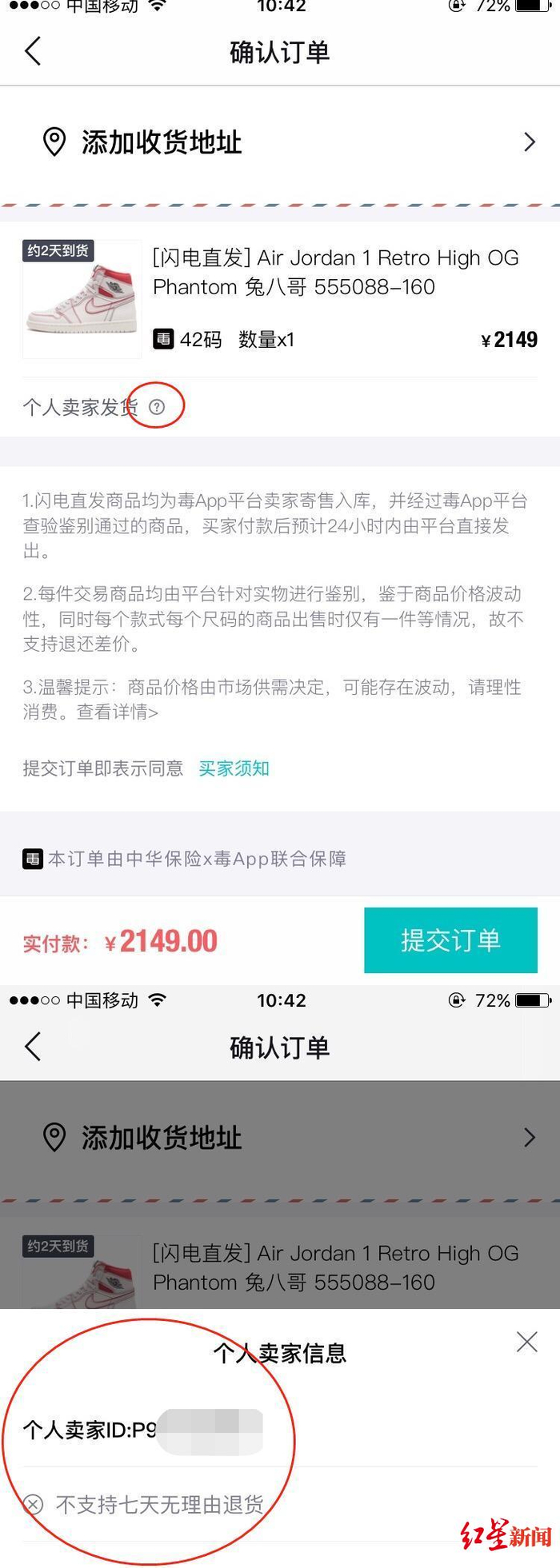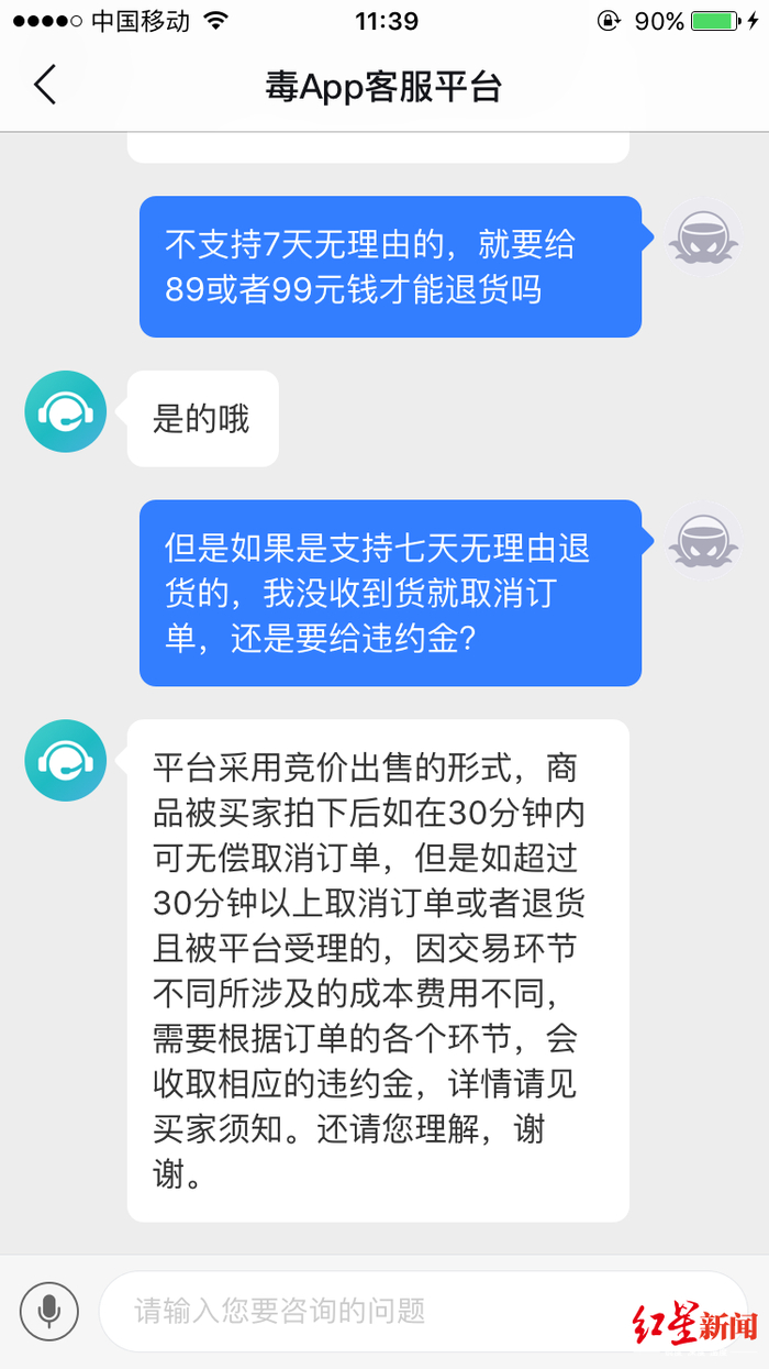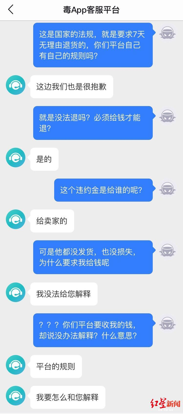 对此,红星新闻记者咨询毒APP客服。客服告诉记者,毒APP只是一个交易平台,平台上的各位卖家有些是支持七天无理由退货,有些是不支持七天无理由退货的,顾客根据自己可接受的条件来决定是否下单购买。