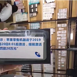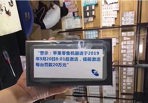 该经销商向红星新闻记者展示的一张图上显示,“警示:苹果零售机器请于2019年9月20日8:01后激活,提前激活每台罚款20万元。”