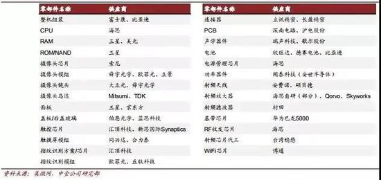 据中金公司研报,华为Mate 20 X 5G整机组装供应商包括比亚迪,摄像头模组供应商有欧菲光,盖板供应商有蓝思科技,面板供应商有京东方A,触控芯片和指纹识别供应商有汇顶科技,触摸屏模组供应商有同兴达和合力泰,连接器供应商有立讯精密和长盈精密,PCB供应商有深南电路和沪电股份,声学器件供应商有歌尔股份,电池供应商有欣旺达和德赛电池以及比亚迪、射频天线供应商有硕贝德。