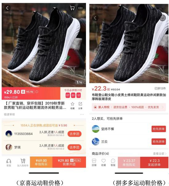 记者分别在京喜APP和拼多多上搜索一双类似的运动鞋,京喜上单独购买价格为69元,拼单价格为29.8元;而拼多多上单独购买价格为23.37元,拼单价格为22.3元。