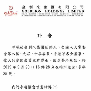 原全国人大常委、香港金利来集团创办人曾宪梓,于20日下午4时因病在梅州逝世,终年85岁。