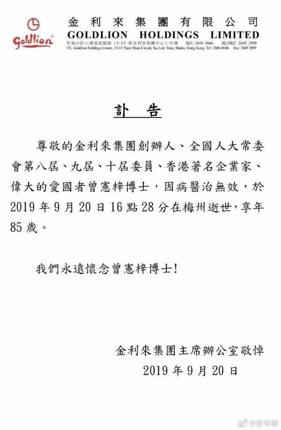 香港金利来集团创始人曾宪梓逝世 终年85岁