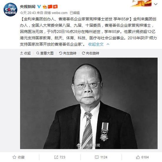 据央视新闻,金利来集团创办人,全国人大常委会第八届、九届、十届委员,香港著名企业家曾宪梓,因病医治无效,于9月20日16点28分在梅州逝世,享年85岁。