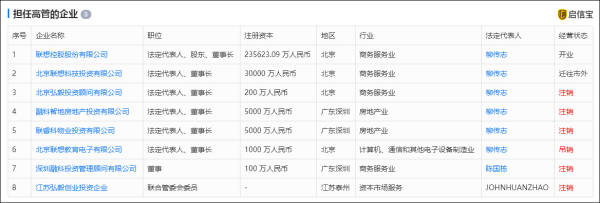 目前,柳传志关联企业25家,其中担任法定代表人17家,担任股东7家,担任高管8家。在他担任法定代表人的企业中,除了联想控股股份有限公司外,其余都显示“迁往市外”或“注销”,包括联想投资有限公司也已经迁往市外。