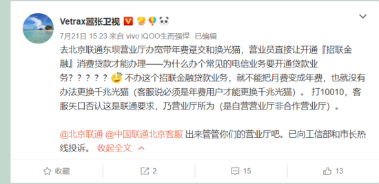今年7月21日,微博认证“电视媒体人,3C数码广播节目评论嘉宾”用户@Vetrax嚣张卫视也反映了同样的现象,在北京联通东坝营业厅办宽带年费趸交和换光猫,营业员直接让开通“招联金融”消费贷款才能办理。但10010客服否认是联通集团的要求,表示是营业厅自己的行为。