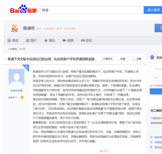 百度贴吧“联通吧”里有用户表示,在客户毫不知情的情况下,私自用客户手机开通网上贷款,并成功网贷2400多元,给客户征信记录造成影响。