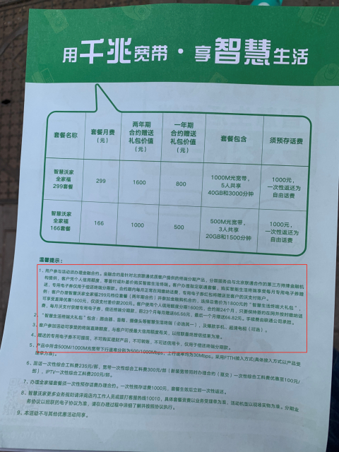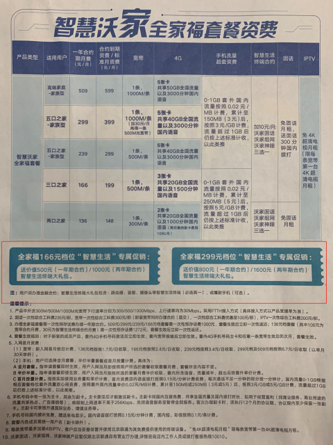 在中国联通展览路营业厅和北展营业厅咨询想要手机开卡和宽带一起办理,营业员均给推荐了“全家福”套餐,其中166套餐“智慧生活”专属促销:送价值500元(一年合约)/1000元(两年期合约)智慧生活终端大礼包;299套餐送价值800(一年期合约)/1600(两年期合约)智慧生活终端大礼包,其注明用户须办理金融合约,大礼包包含路由器、音响、摄像头等。166套餐合约到期后资费标准为199/月,299套餐则变为399/月。
