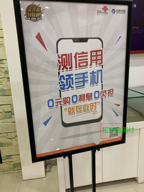 而在北展营业厅也摆放着“测信用,领手机” “0元购、0利息、0负担”的宣传标牌。在咨询该业务过程中,营业员表示,先扫码测信用,看能不能享受活动优惠,能通过的话(授信额度大于享受优惠额度)才能办理,两年合约期,预存1000,赠1000元购机券,买手机只需要补差价就行。办理成功后招联信用我们替您还,合约期内不要欠费,千万别忘了按时缴费,不要删除沃钱包,停机的话是无法返您红包,则招联金融的分期无法偿还。