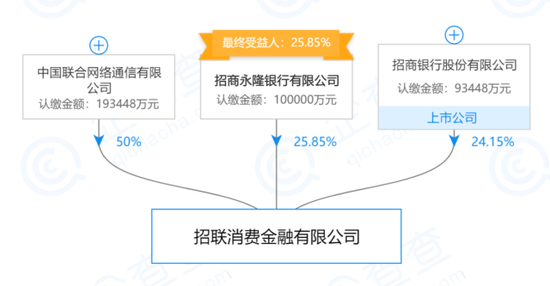 企查查数据显示,招联消费金融目前注册资本38.69亿元,联通持股50%,招行及招行旗下的招商永隆银行合计控股50%。