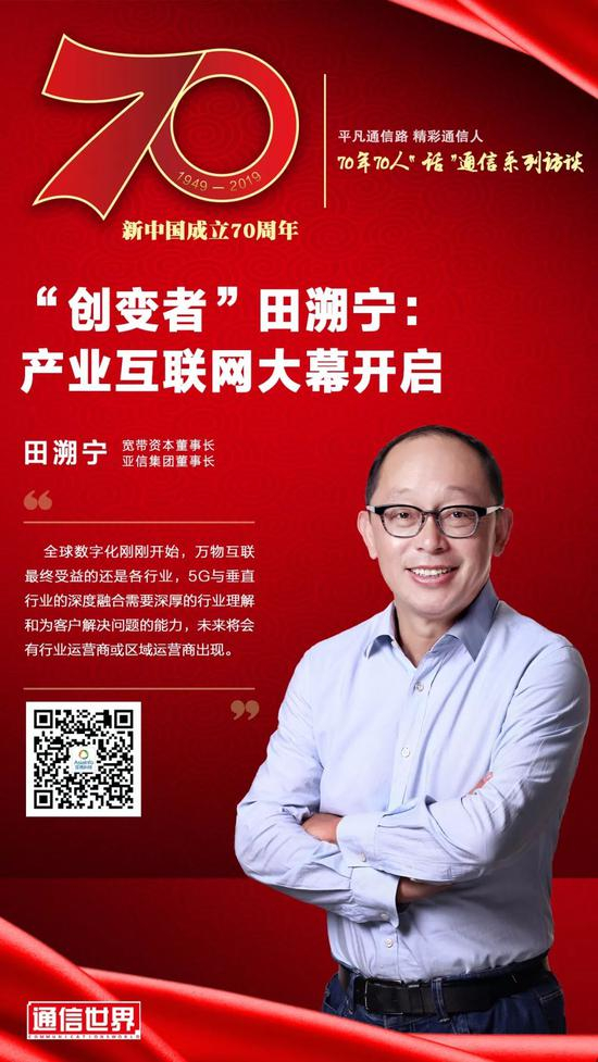 在新中国成立70周年之际,通信世界全媒体记者采访了田溯宁,听他讲述从海外归国布道互联网,到出任国企老总试水体制创新,再到投身资本运作挖掘优质项目,直到5年前回归亚信扛起“产业互联网”大旗这近30年的心路历程。在这位充满传奇色彩、满怀激情与理想主义的创业家背后,一幅信息通信行业70年发展的生动画卷徐徐展开。
