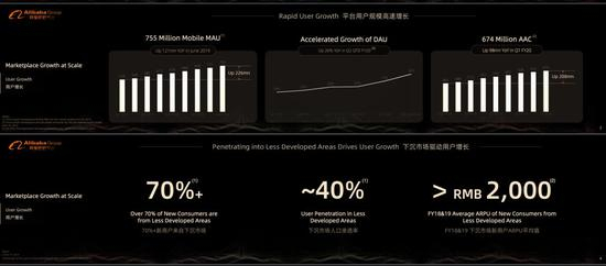 2017年开始,淘宝、天猫活跃买家快速增长,日活用户同比增速从2019财年Q3的20%上涨到2020财年Q1的26%。下沉市场渗透率40%,70%新用户来自下沉市场,第一年下沉市场新用户ARPU平均值为2000,也就是平均消费超过2000元。活跃买家增长来自移动支付普及,以及下沉市场竞争激烈培养了用户。