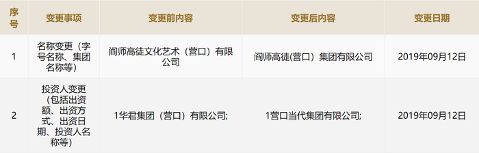 工商资料显示,阎师高徒(营口)集团有限公司(下称“阎师高徒公司”)近日发生信息变更,投资人由华君集团(营口)有限公司变更为营口当代集团有限公司(下称“营口当代集团”)。此外,阎师高徒公司的名称亦从原来的“阎师高徒文化艺术(营口)有限公司”变更为“阎师高徒(营口)集团有限公司”。