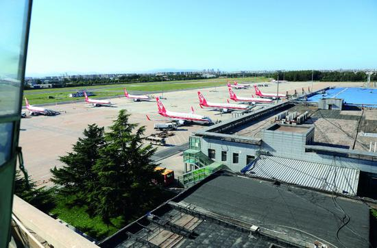 南苑机场气象台窗外俯瞰机场停机坪。