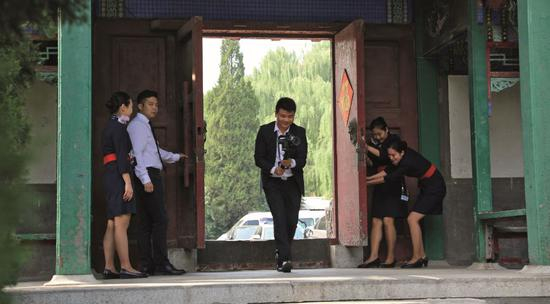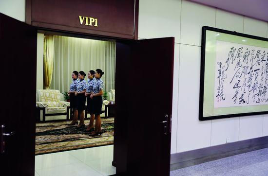 晚上7点左右,机场候机厅VIP厅内,几名工作人员正在认真接受培训。