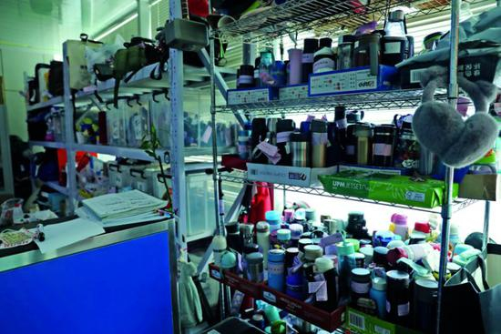 帽子、围巾、书籍证件、水杯、皮箱、化妆品等等被旅客遗失的物品,被管理人员按时间分门别类地安置在失物招领办公间内。