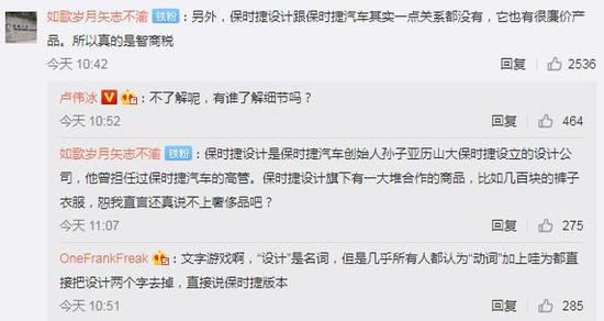 在卢伟冰回怼余承东的微博下方评论中,有网友称,保时捷设计和保时捷汽车并无关系,也有网友表示,这其实是个文字游戏。不过,也有网友指出,“华为从第一代保时捷设计发布时,就说了保时捷设计公司,从没说过是保时捷汽车”,华为“一直宣传的就是‘保时捷设计’,不是‘设计by保时捷’”。(中新经纬APP)