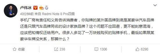 此后,相隔不到两个小时,卢伟冰再发微博发表看法:“手机厂商有责任和义务告诉消费者,你贴牌的某外国品牌到底是某豪华汽车品牌还是只跟汽车品牌同名的设计家族品牌?这个问题不应回避,更不能刻意混淆,应该把知情权还给用户。很多人多花了一万块钱购买的贴牌手机,最后如果跟某豪华车牌没关系,那算什么?”