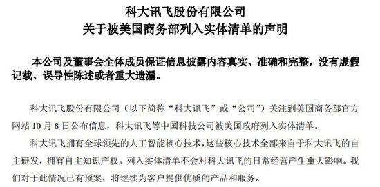 科大讯飞8日午间公,公司关注到美国商务部官方网站10月8日公布信息,科大讯飞等中国科技公司被美国政府列入实体清单。科大讯飞拥有全球领先的人工智能核心技术,这些核心技术全部来自于科大讯飞的自主研发,拥有自主知识产权。列入实体清单不会对科大讯飞的日常经营产生重大影响。我们对于此情况已有预案,将继续为客户提供优质的产品和服务。