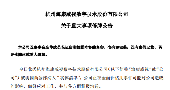 针对公司被列入美国贸易管制黑名单,10月8日,海康威视董秘黄方红表示,海康威视强烈反对美国商务部把公司纳入实体清单,这个决定没有事实根据,呼吁美国政府本着公平、公正、无歧视的原则,重新进行审视,将海康威视移出实体清单。我们必须指出,美国政府的这个决定实质上也将严重损害美国本土企业和众多行业参与者的利益。我们将采取所有合理、恰当的救济方案,以维护公司和合作伙伴的权益。同时,我们将实施各方面的应对预案,公司有能力持续、稳定地为客户提供优质的产品和服务。同时,海康威视午间公告称,公司被美国商务部纳入“实体清单”,公司正在全面评估此事件可能对公司造成的影响,做好应对工作,并与各方面积极沟通。公司股票10月8日起停牌, 不迟于10月10日开市起复牌。公司将于10月9日(星期三)15:30-16:00(北京时间)举行关于公司被美国商务部纳入“实体清单”的投资者电话说明会。