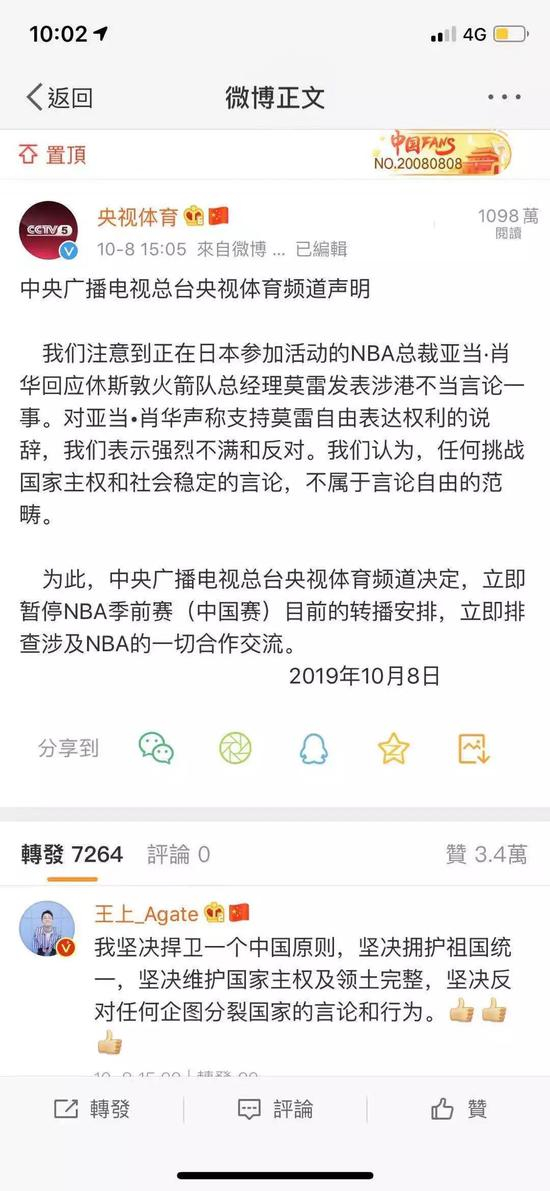 10月8日,中央广播电视总台央视体育频道发出声明,对肖华声称支持莫雷自由表达权利的说辞“予以强烈不满和反对”,为此央视体育频道决定,立即暂停NBA季前赛(中国赛)目前的转播安排,立即排查涉及NBA的一切合作交流。