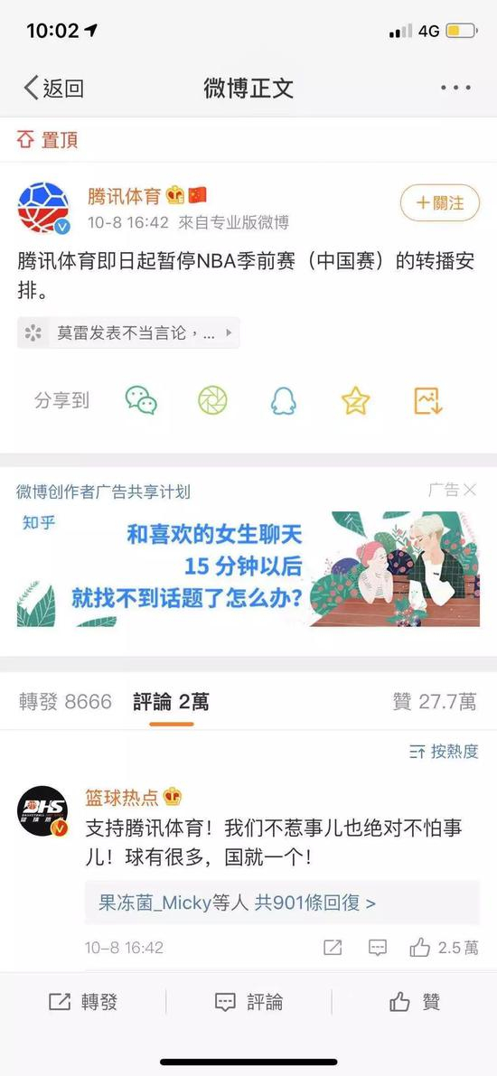 腾讯体育10月8日也在官微表示,即日起暂停NBA季前赛(中国赛)的转播安排。