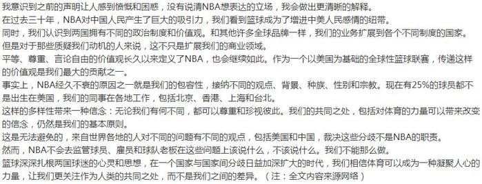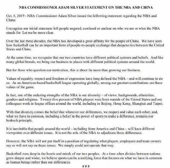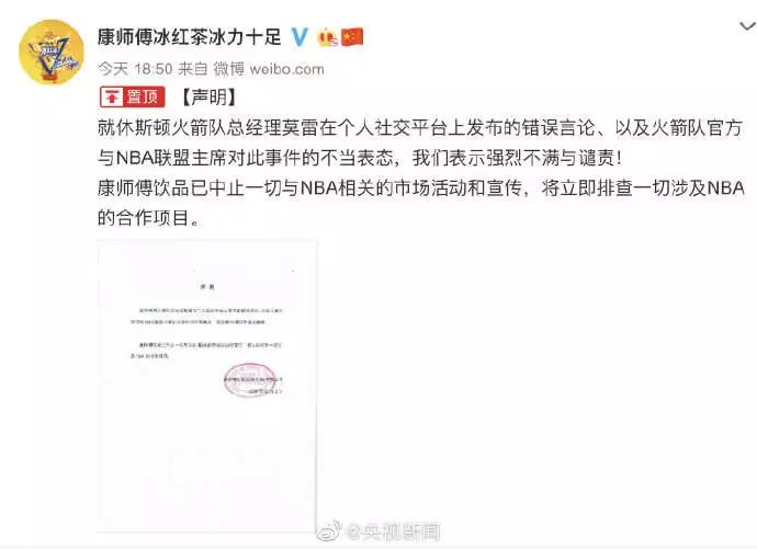 视频来源:观察者网 他说,NBA在中国有很多朋友,很多生意伙伴,包括姚明,我们在某种程度上让他们难过了,这令人遗憾,但他认为,在“言论自由”的前提下交流,往往就会伴随“沟通上的困难”。“我们办公室有直接地与姚明进行沟通。他从进入联盟后就和我成为了亲密的朋友,他非常地沮丧和失望。我之前所表达的尊重言论自由,不仅仅是说莫雷,同样我也支持蔡崇信、姚明表达自己的观点。莫雷的推特确实涉及到了中国的雷区,姚明十分地激动,我接受不同的观点和意见。我希望能与姚明找到共同的解决办法,但他现在正在气头上,并且我也理解。”NBA总裁肖华回应称:“我知道今天下午CCTV发声明说,因为我支持莫雷的表达行为,哪怕不是他的观点本身,就决定禁播。我们没想到会这样,这很不幸,但这样的后果,我们只能承受。”肖华说,自己对这件触怒数百万粉丝的事件“十分遗憾”,因为其本意是通过篮球来兜售梦想和希望(sell dreams, sell hopes),……但结果在人群中制造了失望和不和谐,这是让他遗憾的。NBA球迷之夜,取消!
