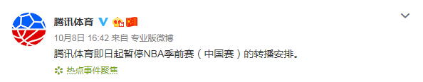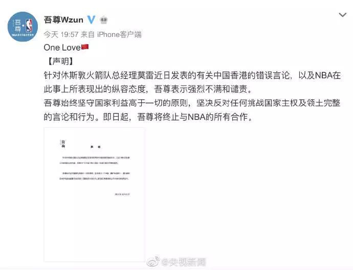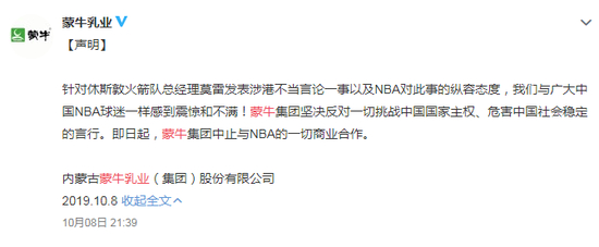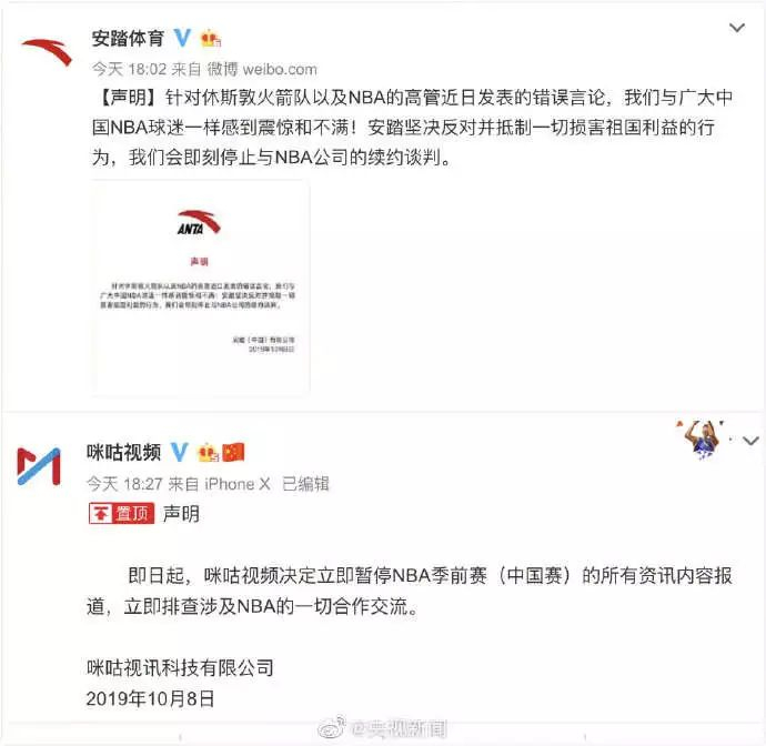 NBA中国形象大使蔡徐坤也于8日中午发表声明:“蔡徐坤先生及蔡徐坤工作室坚决捍卫一个中国原则,坚决拥护祖国统一,坚决维护国家主权及领土完整,坚决反对任何企图分裂国家的言论和行为。即日起,蔡徐坤先生及蔡徐坤工作室与NBA的所有合作即告停止。”