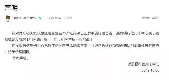 针对休斯敦火箭队总经理莫雷在个人社交平台上发表的错误言论,浦发银行信用卡中心表示强烈抗议及反对!祖国尊严高于一切,祖国主权不容挑战!
