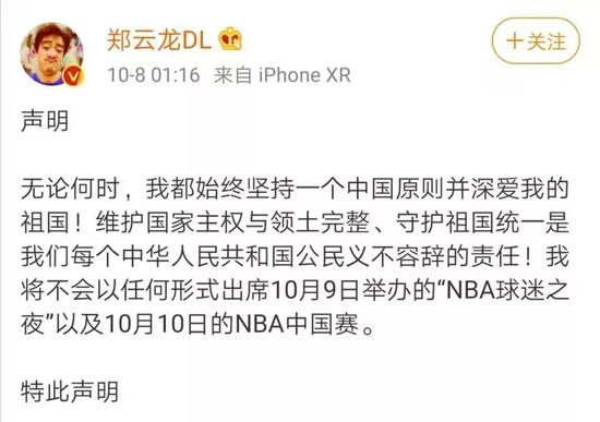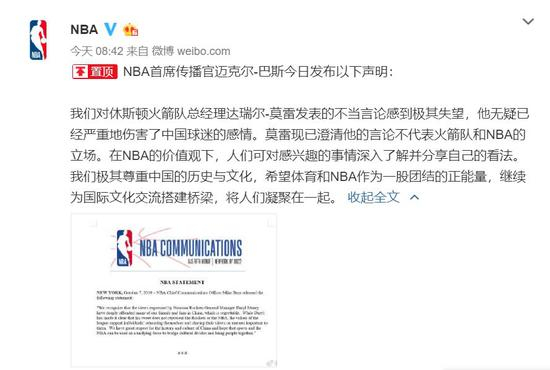 10月7日,NBA官方发布声明表示:莫雷现已澄清他的言论不代表火箭队和NBA的立场。