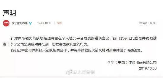 针对休斯敦火箭队总经理莫雷在个人社交平台发表的错误言论,我们表示无比愤慨并强烈谴责!李宁公司坚决反对并抵制一切损害国家利益的行为。我们已中止与休斯敦火箭队相关合作,并将持续敦促火箭队针对该事件给予明确答复。