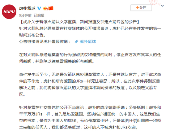 事件发生后至今,无论是火箭队总经理莫雷本人,还是其球队官方,对于此次事件的不作为,虎扑和所有爱国的JRs一样无法容忍,所以,在此次事件得到妥善解决之前,我们将暂停火箭队的文字直播和新闻资讯的报道,以及锁定火箭专区。