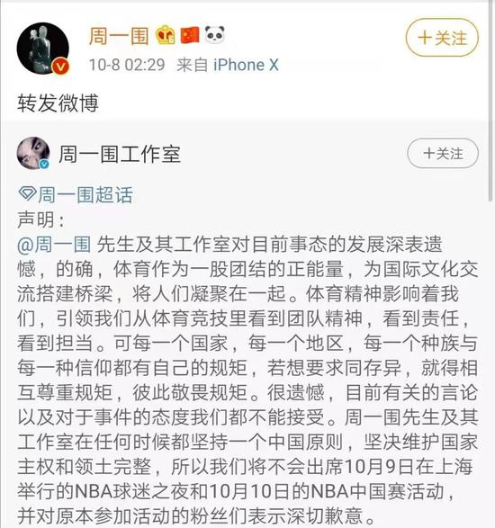 “我一直赞赏中国粉丝和赞助商的大力支持,我希望那些失望的人能明白,冒犯或者误解并非我的本意。我的推特只代表我本人,绝不代表火箭队或者NBA。”