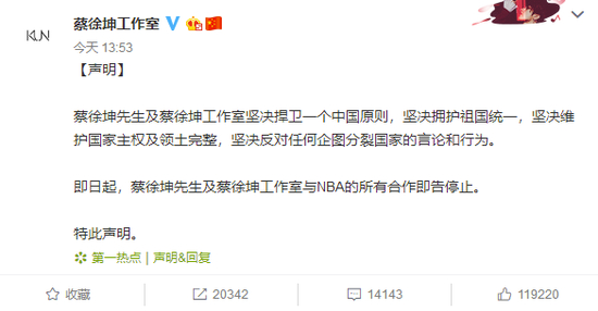 鉴于休斯敦火箭队总经理达瑞尔-莫雷于北京时间10月5日于推特上发布损害祖国统一的言论。我司作为中华人民共和国企业,对此事感到无比愤慨!已第一时间告知休斯敦火箭队,我司将立即中止与休斯敦火箭队的全部合作事项。