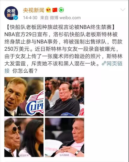 2014年,当时的快船队老板斯特林与女友一段录音被曝光,涉及种族歧视言论。