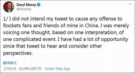 “我无意通过自己的推特冒犯火箭队粉丝和我在中国的朋友们。我只是基于某种阐释,对一个复杂事件表达某一种想法。自那条推特发出以后,我有机会倾听和思考其他(思考问题的)角度。”