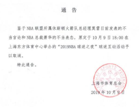 据上海市体育总会官方微博10月9日消息,鉴于NBA联盟所属休斯顿火箭队总经理莫雷日前发表的不当言论和NBA总裁萧华的不当表态,原定于10月9日18:00在上海东方体育中心举办的“2019NBA球迷之夜”球迷互动活动予以取消。
