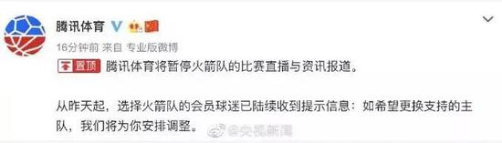 腾讯体育将暂停火箭队的比赛直播与资讯报道。从昨天起,选择火箭队的会员球迷已陆续收到提示信息:如希望更换支持的主队,我们将为你安排调整。