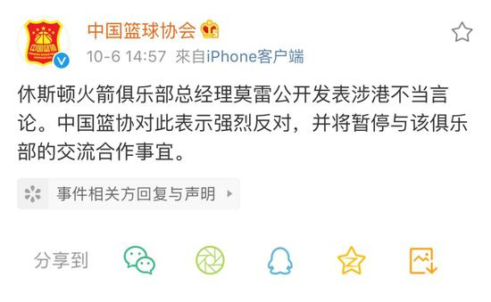 此前,中国篮协、中央广播电视总台央视体育频道相继宣布暂停与火箭俱乐部的交流合作、转播等事宜。除此之外,休斯敦火箭队在中国的多家赞助商纷纷发表官方声明,宣布暂停或终止与火箭队的相关合作。