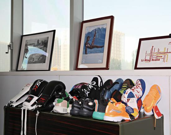李宁办公室窗边 放着李宁品牌的拳 击手套和球鞋。 摄影/刘阳