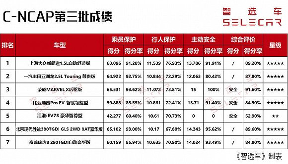 ③· 本次C-NCAP测试成绩整体低于2019年第二批的测试成绩,综合得分率90%以上的车型仅有一款,为荣威MARVEL X后驱版。