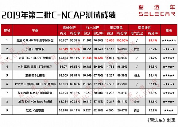 ①· 从本次测试结果来看,除了江淮iEV7S获得2星评级外,其余车型均是5星的成绩。