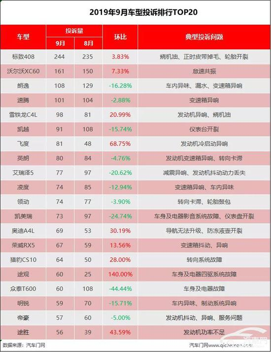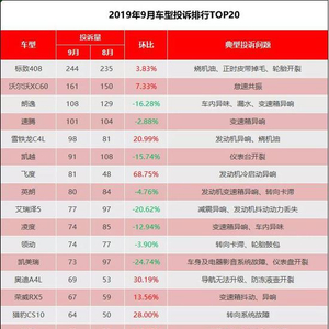 日前,汽车质量投诉平台汽车门网发布了2019年9月国内汽车质量投诉分析报告。其中,在搜集的693个车型7073宗投诉中,标致408以244宗投诉量再度蝉联投诉排行榜榜首。