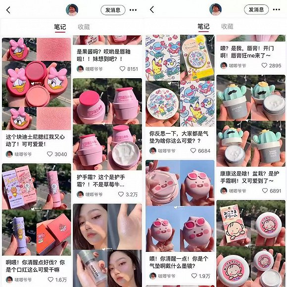 小红书博主@啵唧爷爷 目前粉丝数29.8万,之前发布的内容多为口红试色、妆容教程等,直到8月底,她分享的几篇关于小众可爱彩妆的笔记火了,点赞数从原先的几百上涨到几千,甚至几万不等。