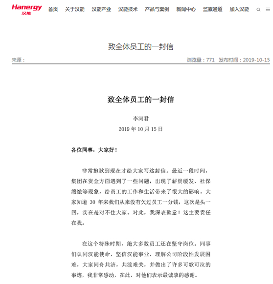 10月15日,汉能创始人、汉能移动能源控股集团董事局主席李河君发布《致全体员工的一封信》,首次就“欠薪事件”进行回应。