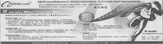 ●“此时此刻,非我莫属”——1999年9月14日,阿里巴巴在《钱江晚报》上发了第一条招聘广告。上面的广告语是:If not now,when?Ifnot me,who?此时此刻,非我莫属。