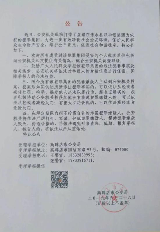 这或许是华银的写照。2019年6月26日,河北省高碑店市公安局发布公告称,已经成功打掉了盘踞在涞水县以华银集团为依托的犯罪集团,要求受害人配合调查取证,限令犯罪嫌疑人主动投案。