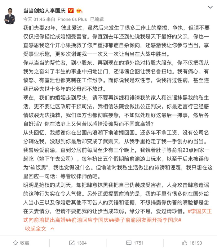 新浪财经讯,10月23晚,当当网董事长兼ceo俞渝在李国庆朋友圈下回复手撕李国庆,爆料称李国庆并不是净身出户,而是从家里拿走了一亿三,这其中有俞渝和其父母的存款。并指出李国庆联合公关操纵媒体,每件事都在撒谎。